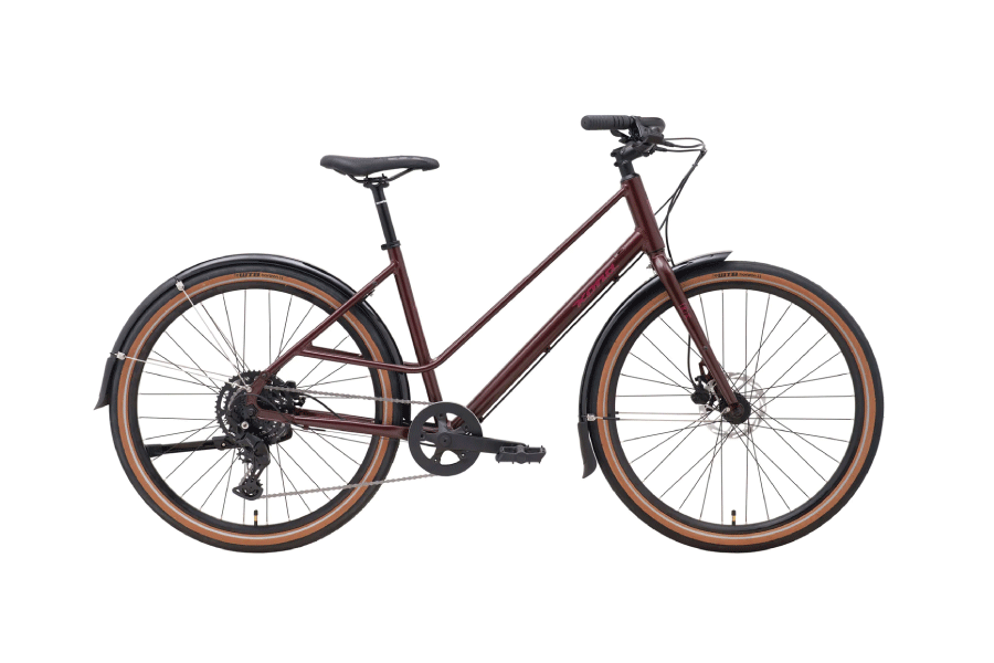 Cadre bas, transmission 9 vitesses Shimano Altus, freins à disque mécaniques : pratique et efficace en ville.